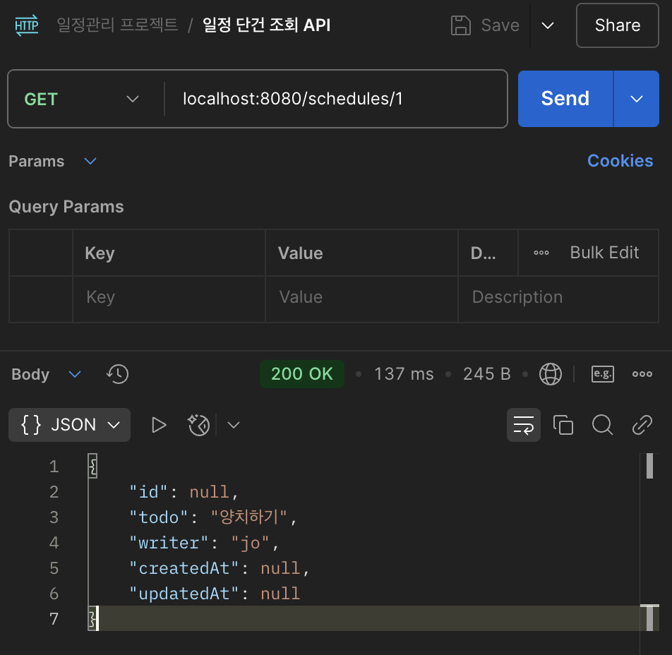 | 선택 일정 조회 | GET | /schedules/{scheduleId} | 요청 param | 단건 응답 정보 | 200: 정상조회 |