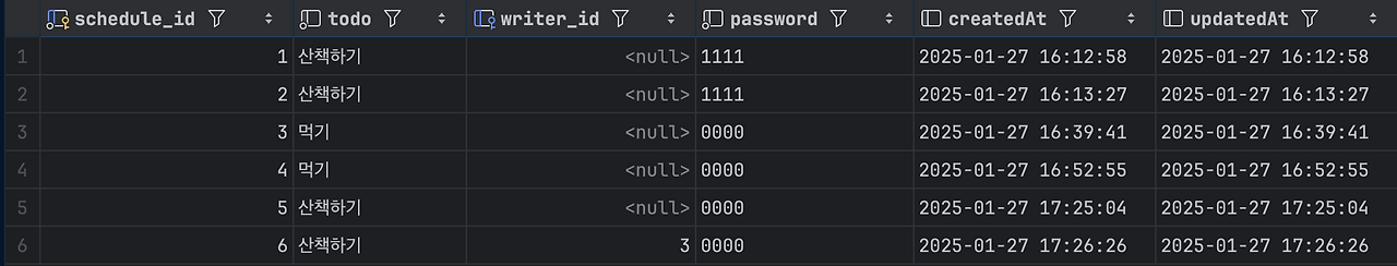 todo, writer, password는 not null로 설정했다.