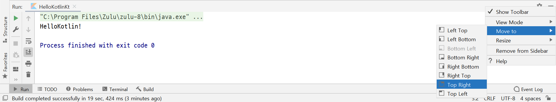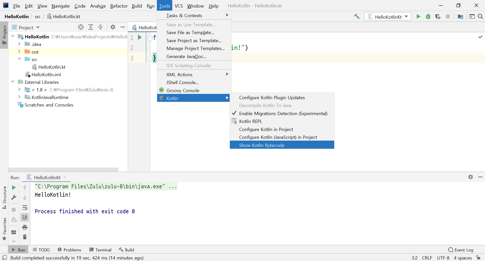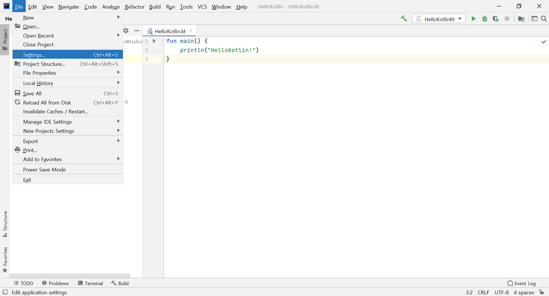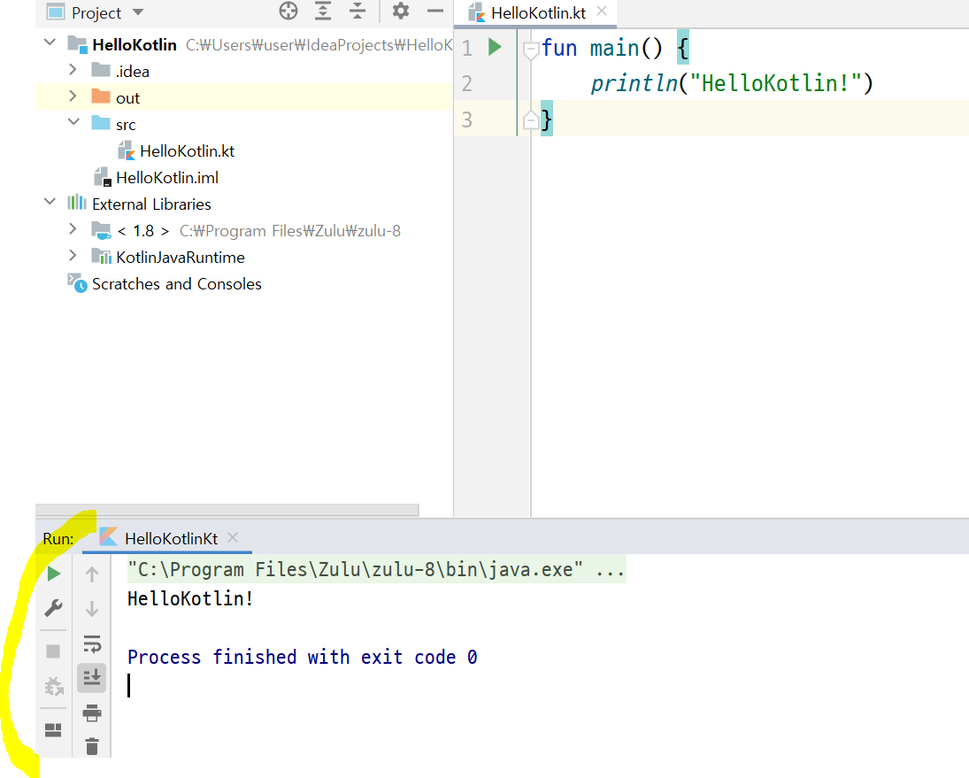 이 사진을 보시면 콘솔창에 HelloKotlin!이라고 출력된 것을 볼 수 있습니다.