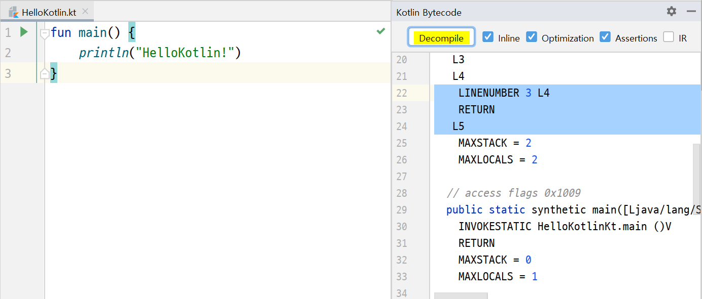 현재 이 코틀린 코드가 JVM상에서 동작하기 위해 어떻게 중간코드가 있는지 알 수 있습니다.