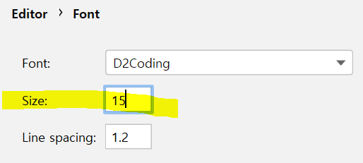 Font탭에서 Font를 D2Coding으로 지정합니다.