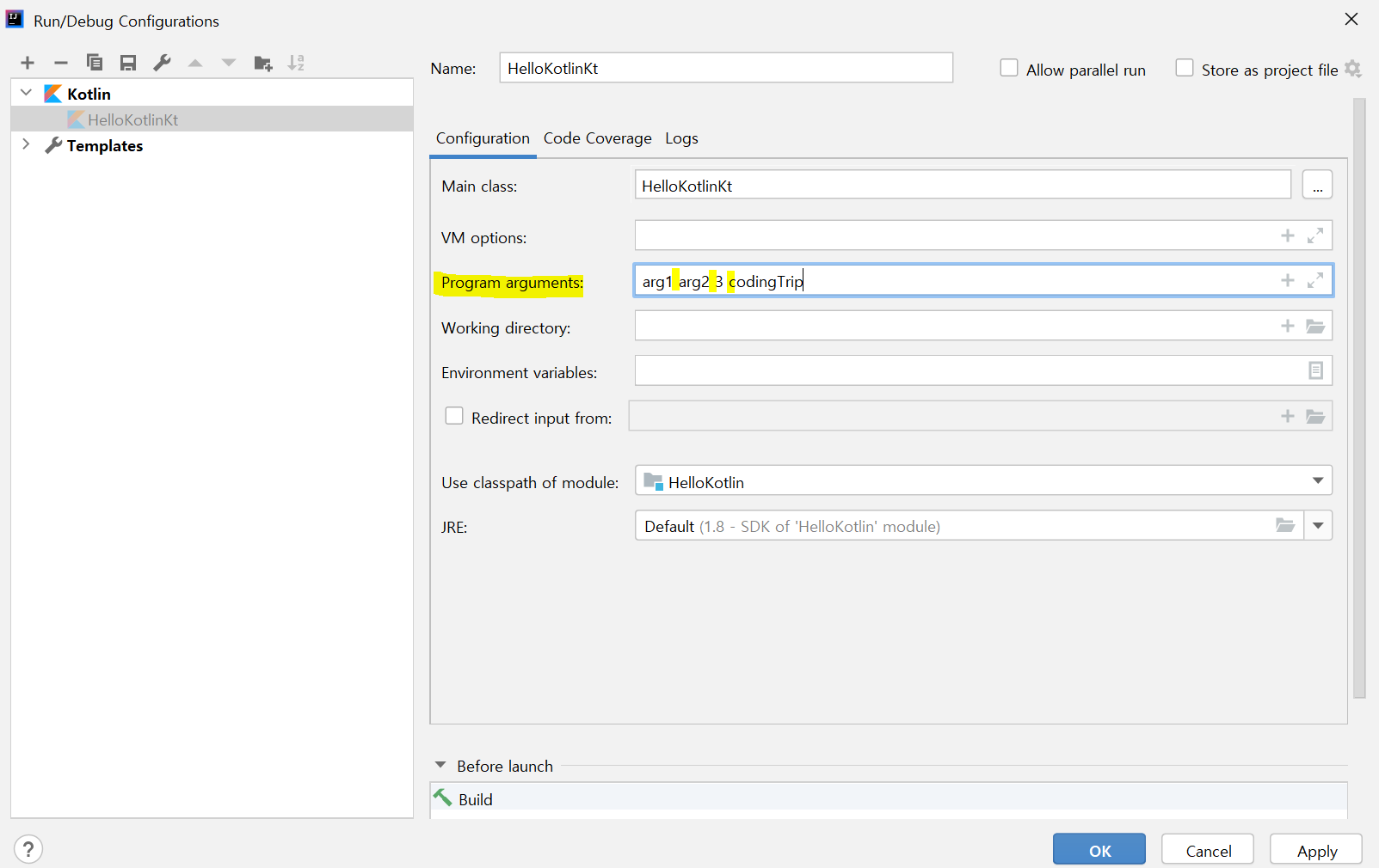 저는 arg1 arg2 3 codingTrip을 입력했습니다. 띄어쓰기로 구분하시면 됩니다.