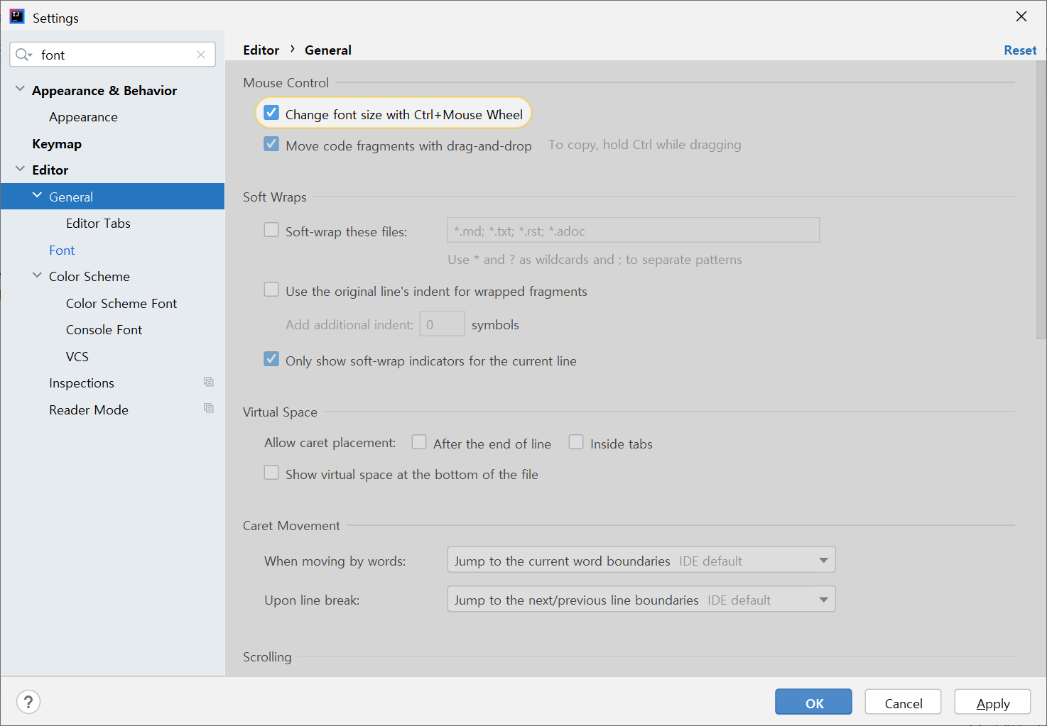 General탭에서 Change font size with Ctrl+Mouse Wheel을 선택합니다.