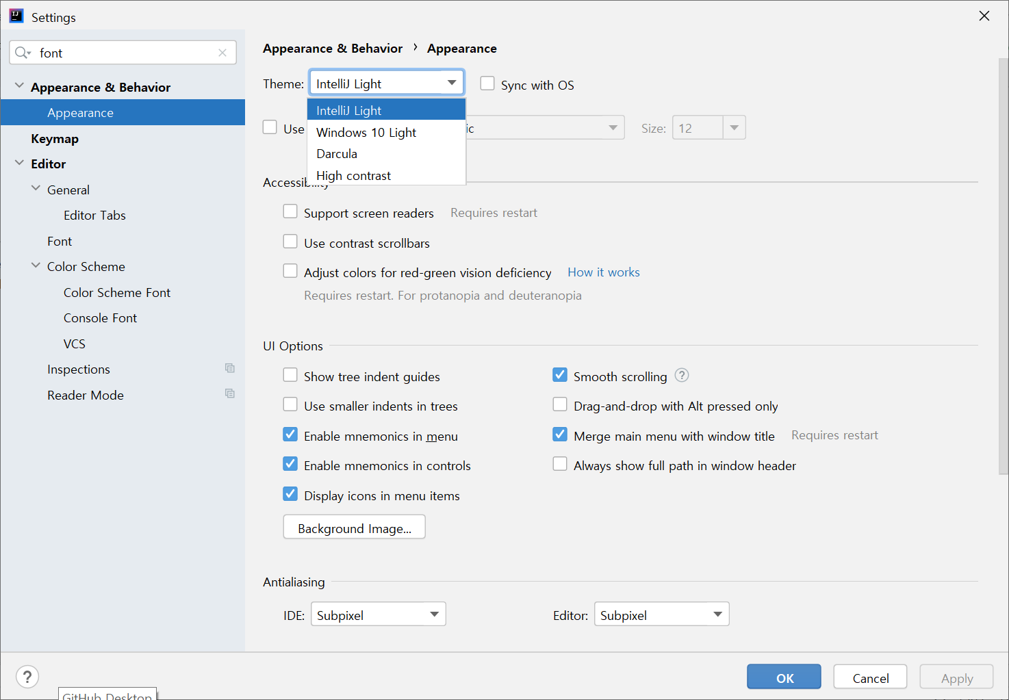 font를 검색하고 Apperarance탭에서 테마를 Intellij로 선택합니다.