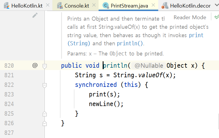 코틀린 코드에서 println에 커서를 두고 Ctrl+B를 하면 Console 라이브러리로 들어갑니다.
