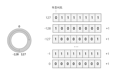 환형 형태로 데이터의 한계 때문에 더하기만으로서 음수를 표현합니다.