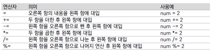 할당문을 위해서 대입 이항 연산자 =를 사용합니다.
