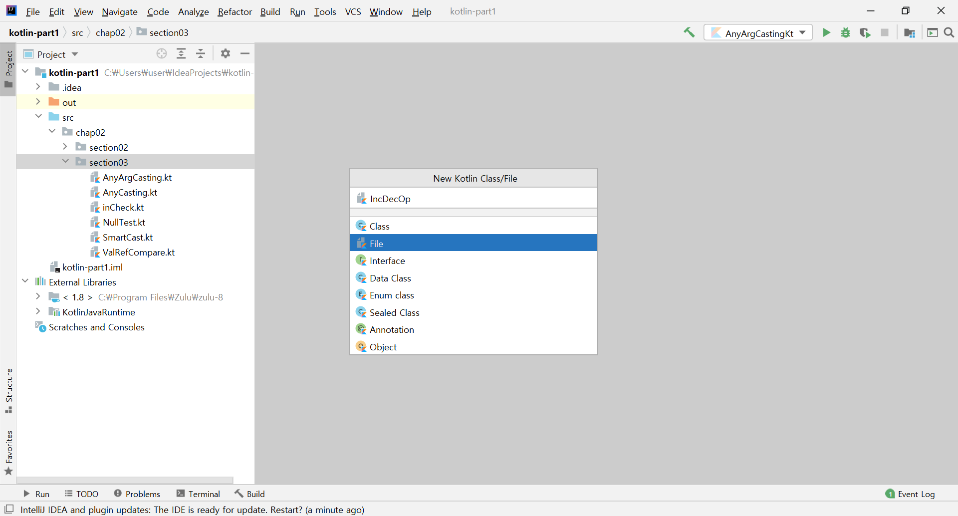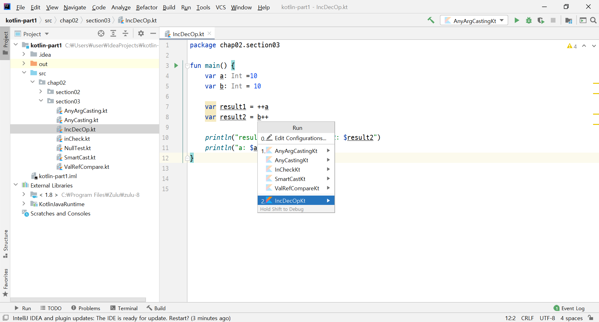 파일명을 IncDecOp로 코틀린 파일을 만듭니다.