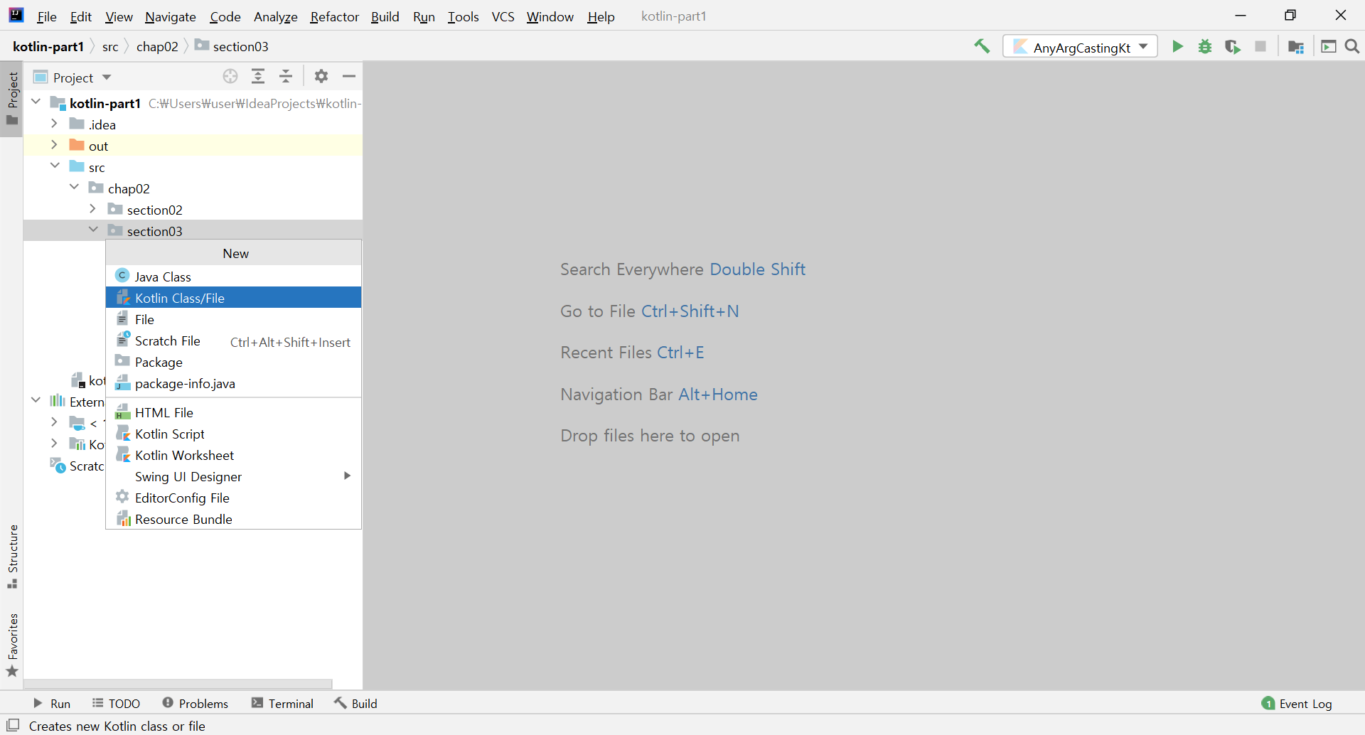 section03 폴더에 Alt+Insert을 누르고 Kotlin Class/File을 선택합니다.