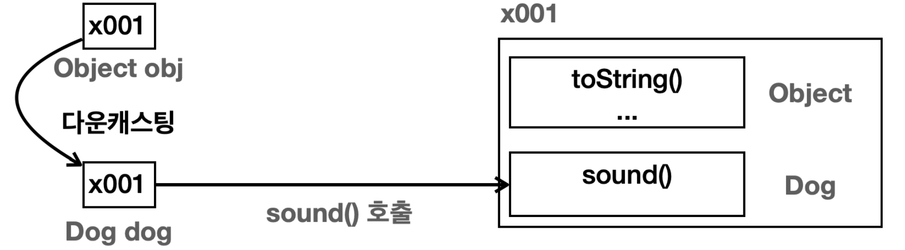 Dog 인스턴스의 sound() 를 호출하려면 다음과 같이 다운캐스팅을 해야한다.