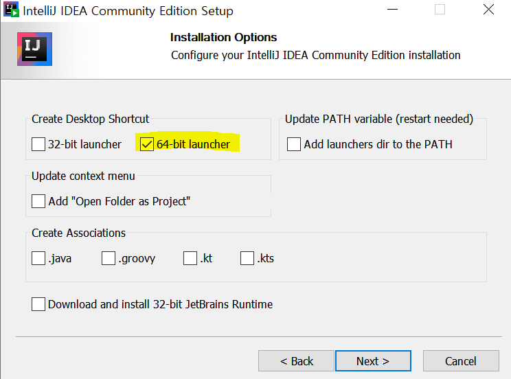 2. Intellij IDEA 설치 실행, 64-bit launcher만 클릭한 후 설치하기