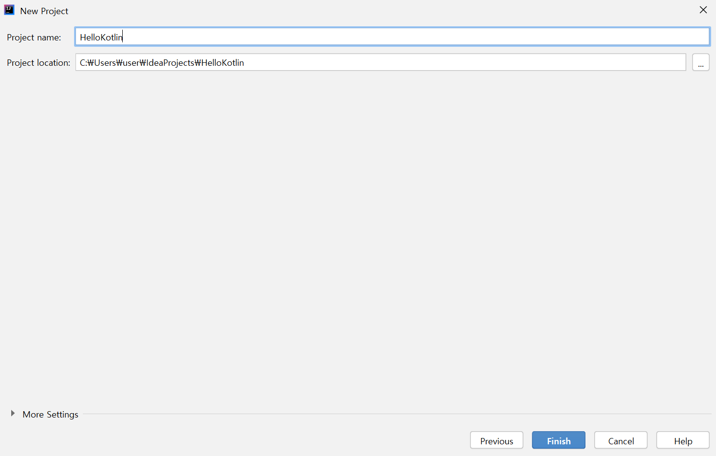 Project name을 HelloKotlin으로 설정하고 Finish버튼을 클릭하여 새로운 프로젝트를 생성합니다.