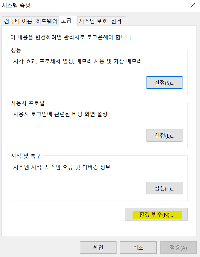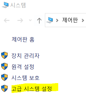 고급 시스템 설정을 클릭하고 환경변수를 클릭합니다.