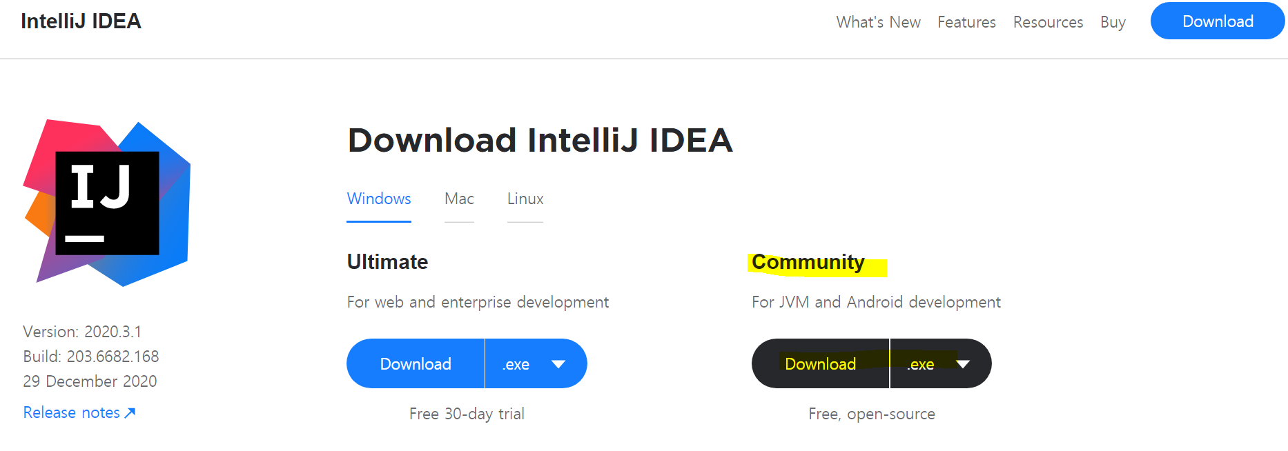 위의 URL링크로 들어가서 IntelliJ IDEA를 다운로드합니다.