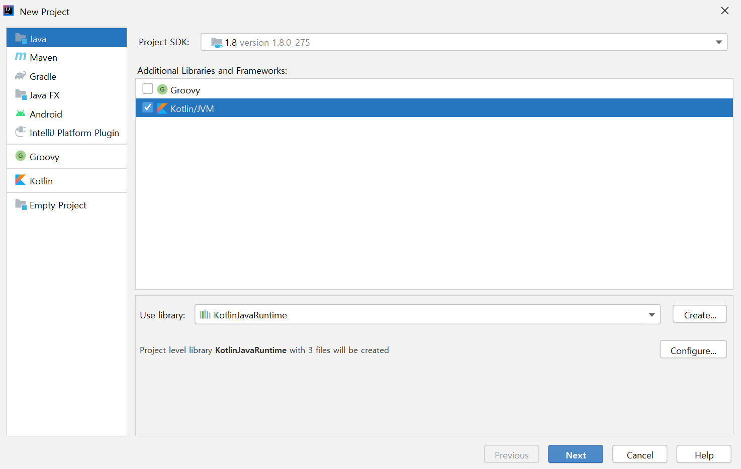 그래서 저는 Java탭에서Kotlin/JVM을 선택해서 진행했습니다.