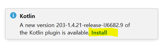 오른쪽 하단에 이런 안내창이 나오실 거에요. Install을 클릭하셔서 코틀린의 새로운 버전을 바로 설치하셔도 되고요.