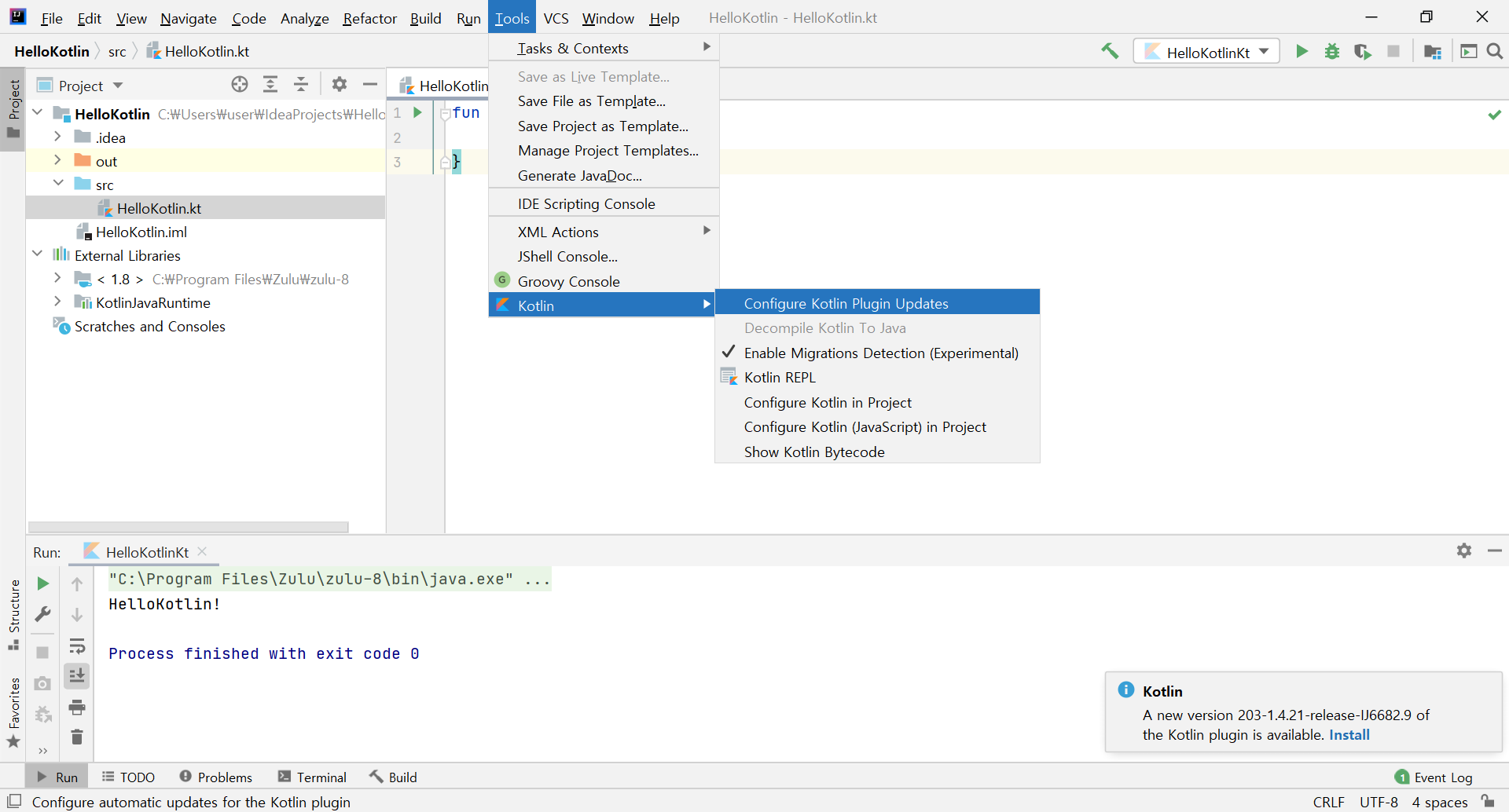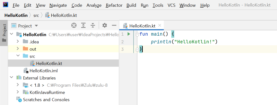 위와 같이 HelloKotlin!이라고 입력합니다.