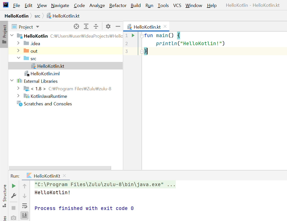 그러면 위와 같이 아래 결과창에 HelloKotlin!이 출력되는 것을 확인할 수 있습니다.