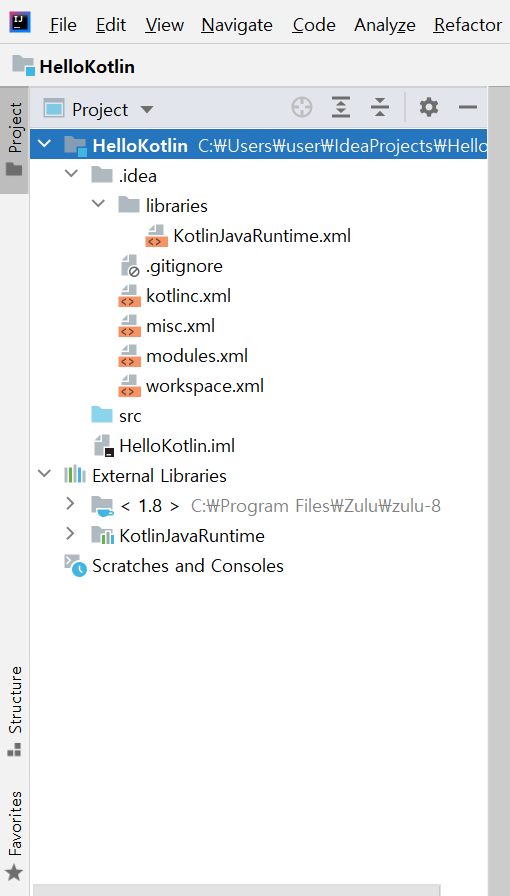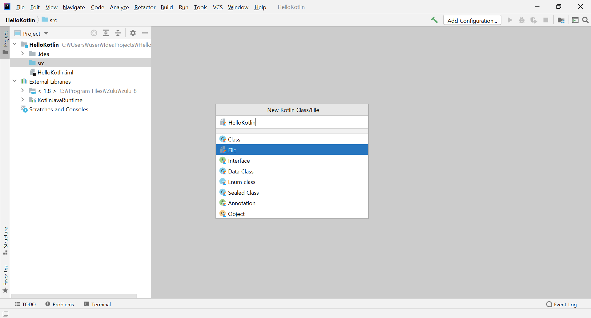 다음은 지금은 텅 비어있는 src폴더(source)에 새로운 Kotlin 파일을 만들어볼까요?