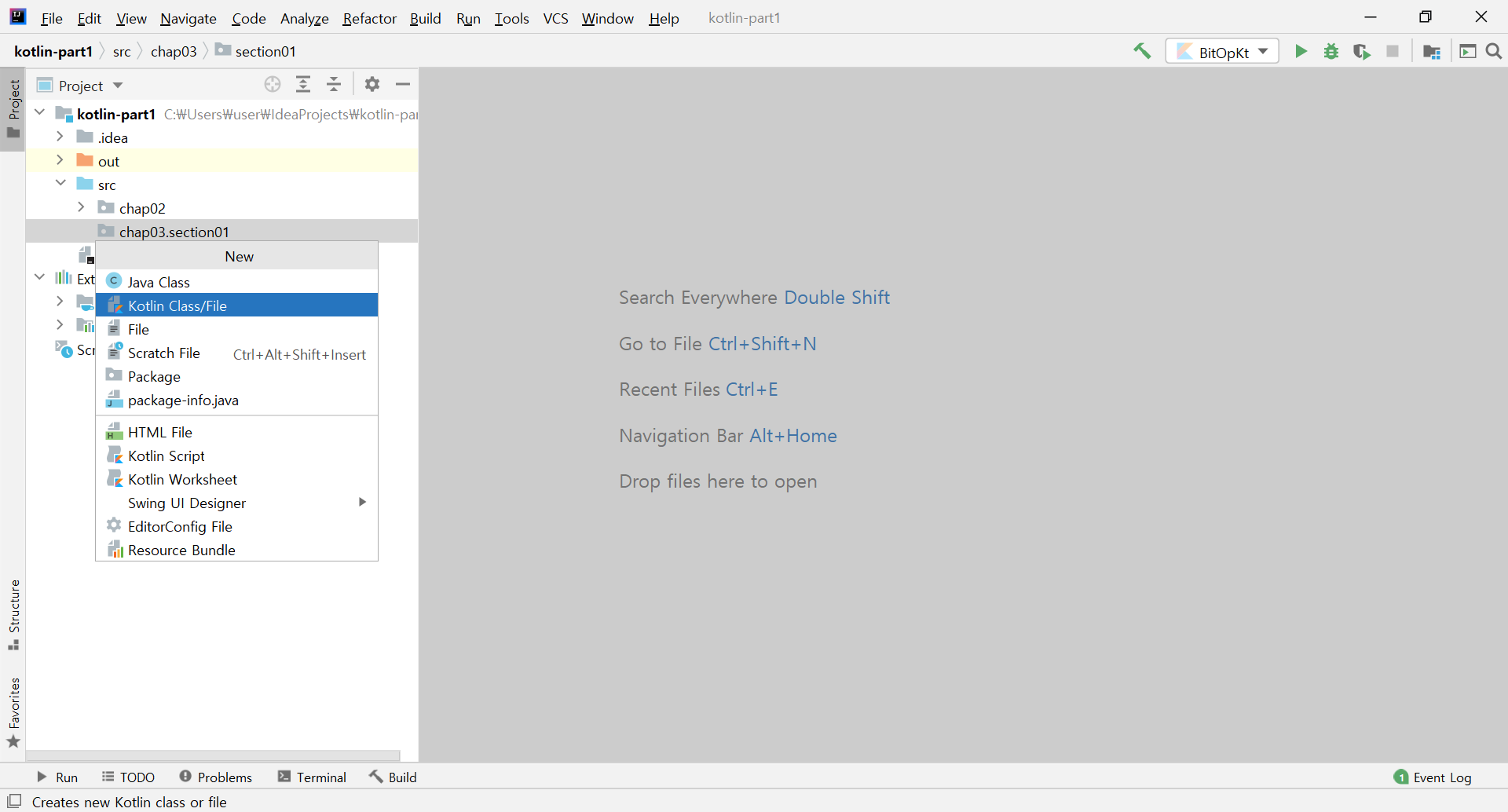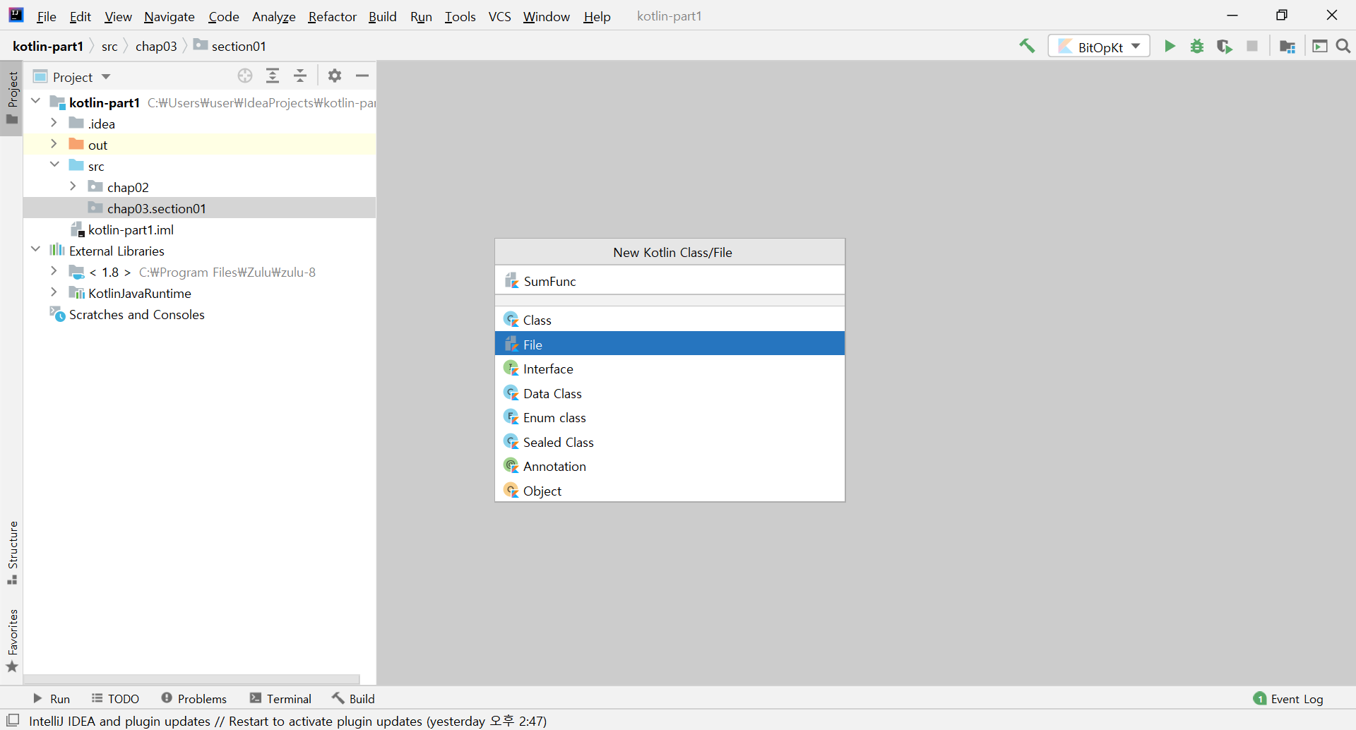 Alt+Insert한 뒤 코틀린 파일을 만듭니다.