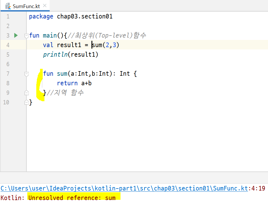 일단 코틀린은 sum이라는 함수의 이름을 모릅니다.