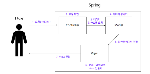 - Controller: 요청을 처리하고 Model과 View를 연결, 사용자 요청을 처리